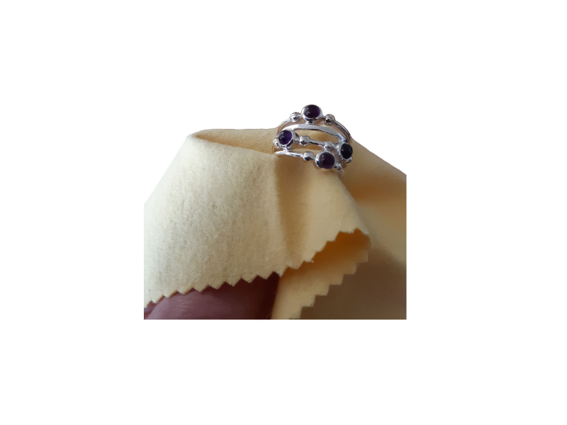 Een ‘dompelbadje’, zoals dat bij de juwelier te koop is, is niet geschikt voor sieraden met edelstenen, want dat tast de edelstenen aan. Wij raden je daarom aan een zilverpoetsdoek te gebruiken.