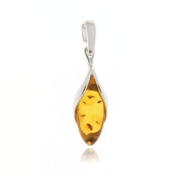 Unieke hanger gemaakt van 925 sterling zilver met een marquise vormige Barnsteen edelsteen. De afmeting van de hanger is 32 x 10 mm. De Barnsteen is mooi doorschijnend met een cognac-kleurige gloed.