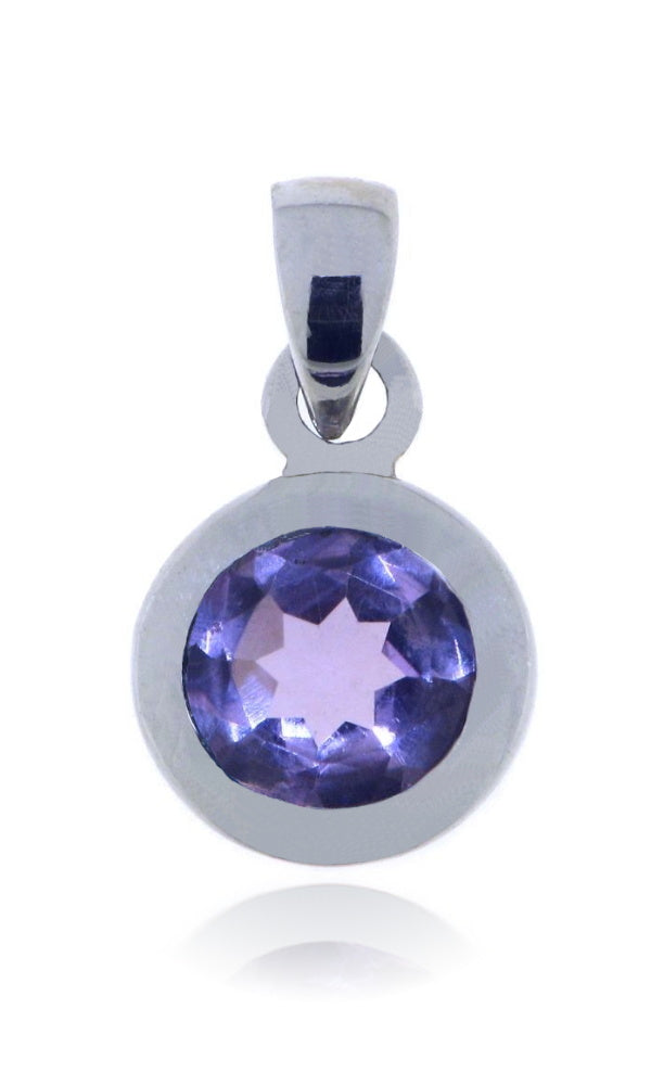 Ronde hanger gemaakt van 925 sterling zilver met een 9 mm facet geslepen Amethist edelsteen. De afmeting van de hanger is 20 x 11 mm.
