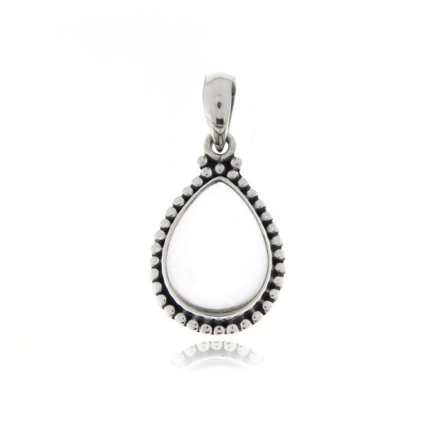 Druppelvormige hanger gemaakt van 925 sterling zilver met een 16 x 12 mm cabouchon geslepen Bergkristal edelsteen. De afmeting van de hanger is 30 x 15 mm.