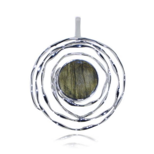Ronde hanger gemaakt van 925 sterling zilver met een 17 mm cabouchon geslepen Labradoriet edelsteen. De hanger heeft een afmeting van 40 x 40 mm.