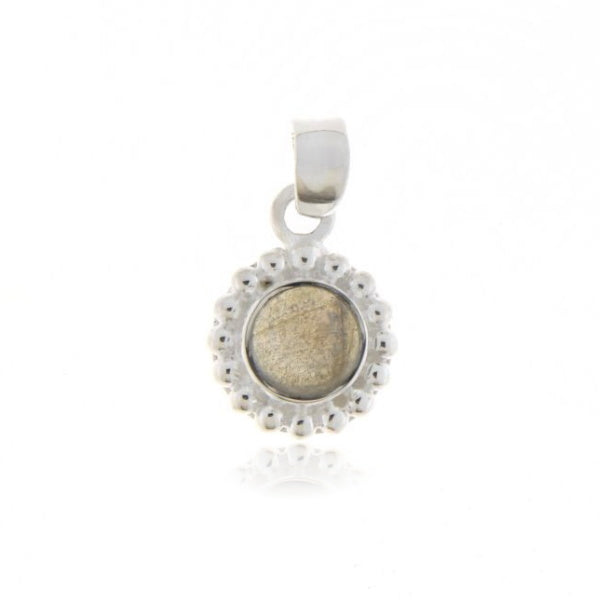 Hanger gemaakt van 925 sterling zilver met een 6 mm cabouchon geslepen ronde  Labradoriet edelsteen. De hanger heeft een afmeting van 18 x 10 mm.