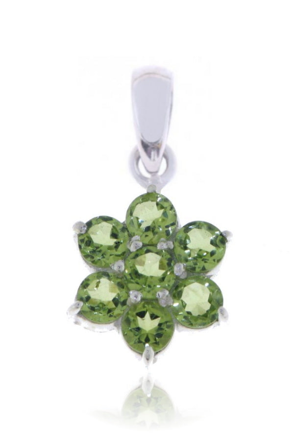 Bloem hanger gemaakt van 925 sterling zilver met facet geslepen Peridoot ronde edelstenen. De hanger heeft een afmeting van hanger 23 x 13 mm.