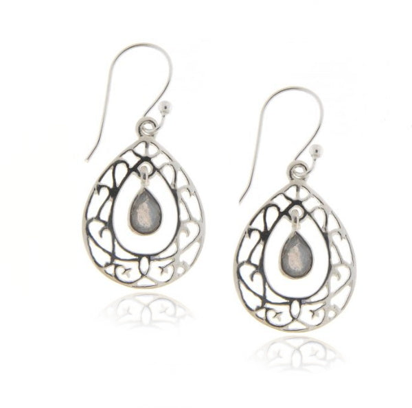 Oorhangers gemaakt van 925 sterling zilver met druppel vormige Labradoriet edelstenen. De oorhangers hebben een afmeting van 35 x 18 mm.