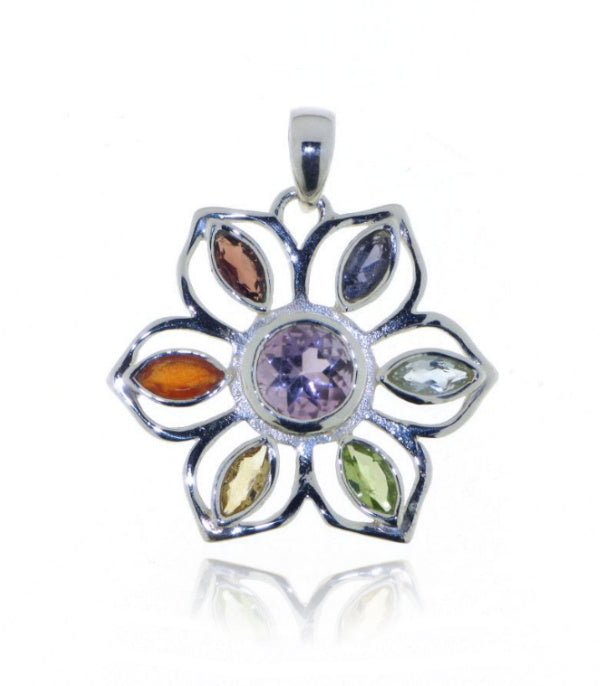 Zilveren hanger gemaakt van 925 sterling zilver met diverse edelstenen: Amethist, Ioliet, Blauwe Topaas, Peridoot, Citrien, Carneool en Granaat. De hanger heeft een afmeting van 33 x 28 mm.