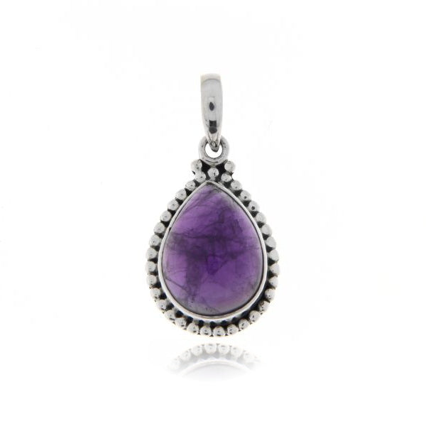 Druppelvormige hanger gemaakt van 925 sterling zilver met een 16 x 12 mm cabouchon geslepen Amethist edelsteen. De afmeting van de hanger is 30 x 15 mm.