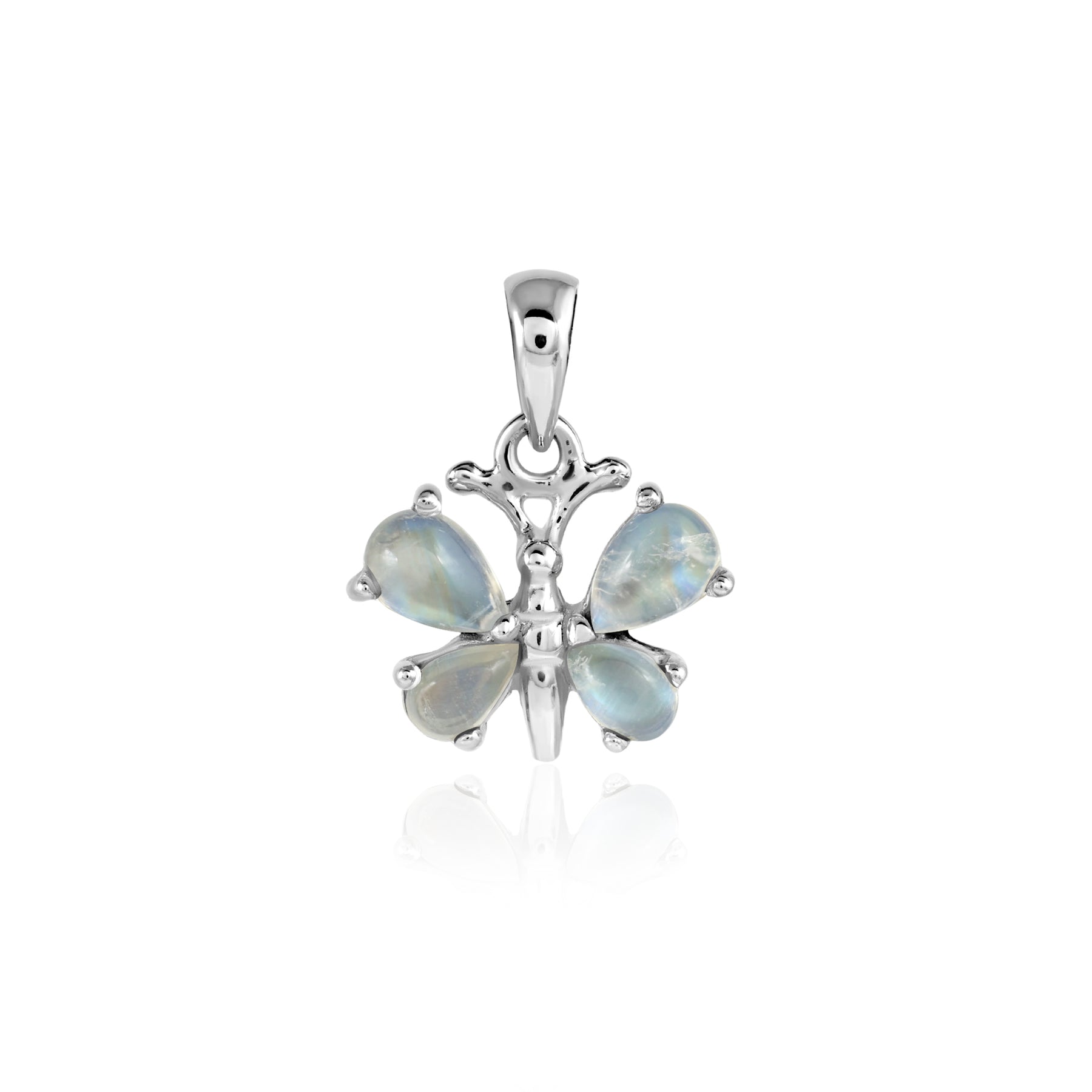 Vlinder hanger gemaakt van 925 sterling zilver met Regenboog Maansteen edelstenen. De hanger heeft een afmeting van 21 x 16 mm.
